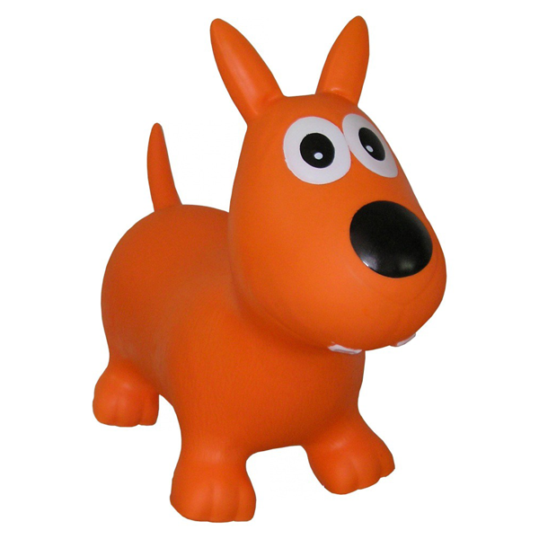 Фигурный мяч выполнен в виде собаки. У нее устойчивые лапы, выразительная мордашка с крупными глазами, задорный хвостик. Она окрашена в яркий оранжевый цвет, на поверхность нанесен рельефный рисунок, имитирующий шерсть.